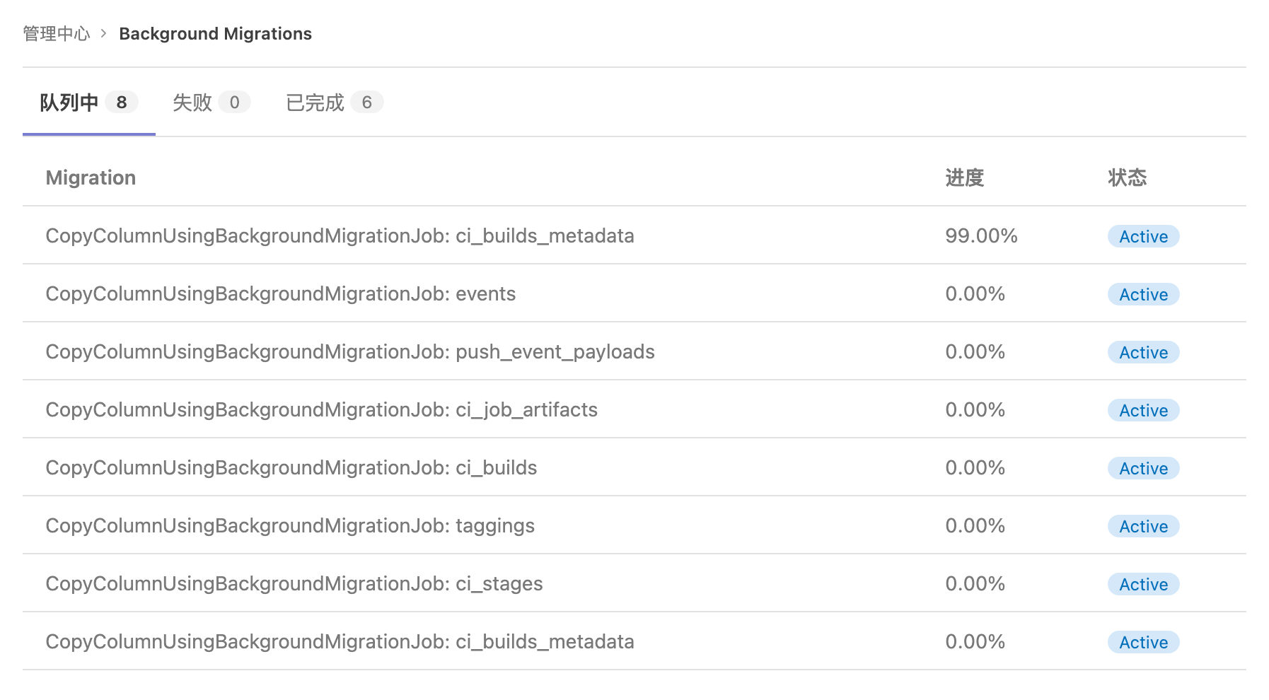 当队列和失败都为0时,才能进行下一步升级。详见官方文档 Check the status of batched background migrations