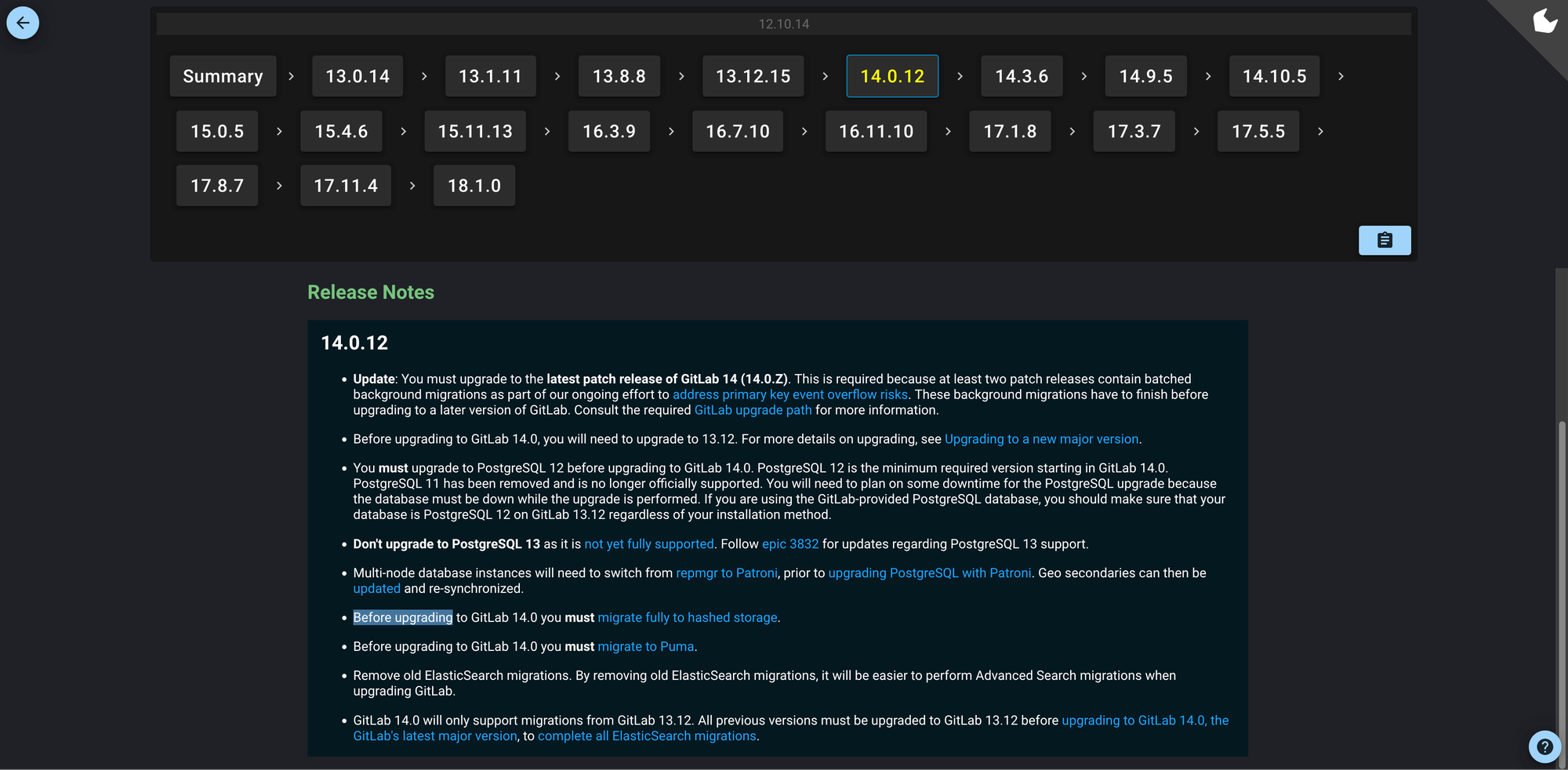 Gitlab 升级需要严格遵循升级路径,大体上是每个子版本都需要,确保所有的库 migration 代码执行。可使用工具 Upgrade Path Tool 查询升级路径。